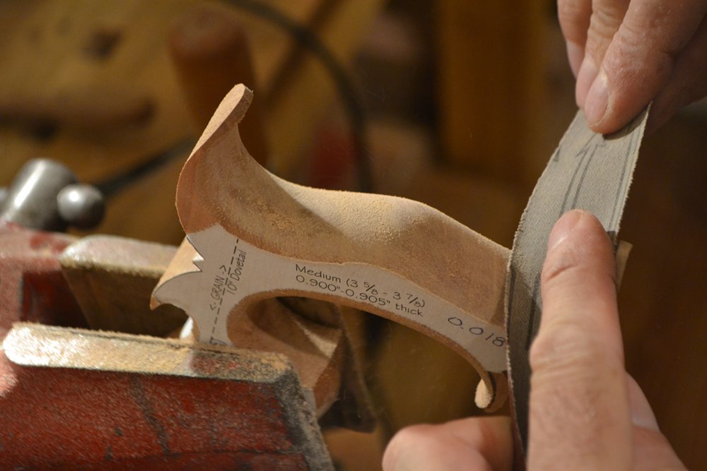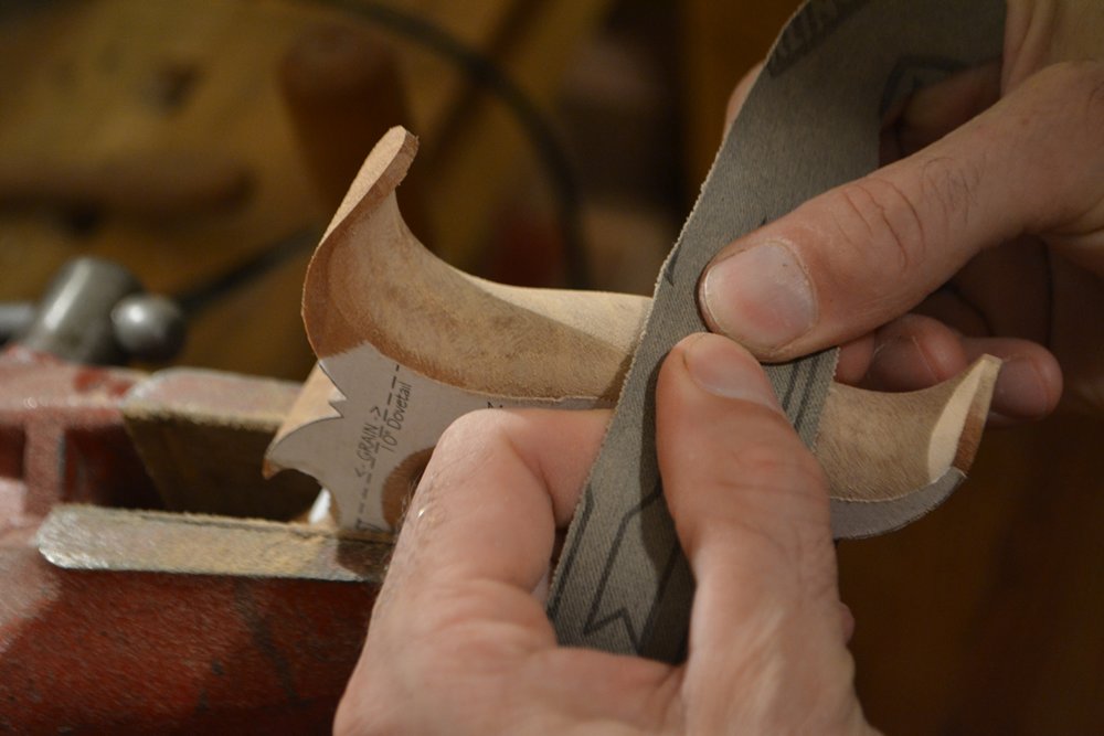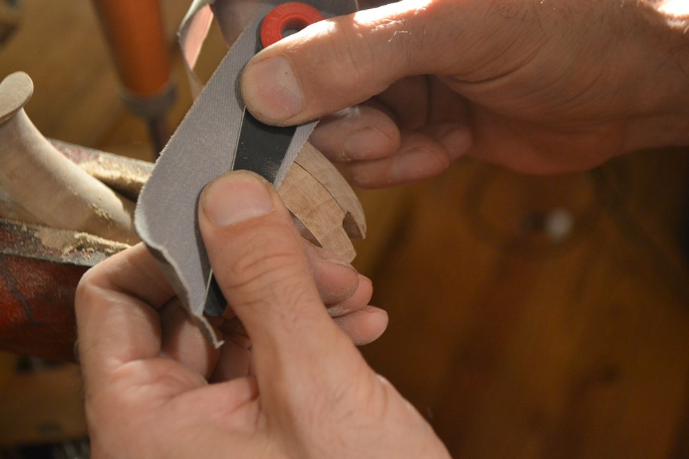 Sanding in this manner gives nicely rounded contours that are pleasantly framed and contrasted by well-defined flats. George Wilson put it well when he said that the resultant curves are reminiscent of calligraphy. While the lines look crisp, they are nearly imperceptible to the hand in use.