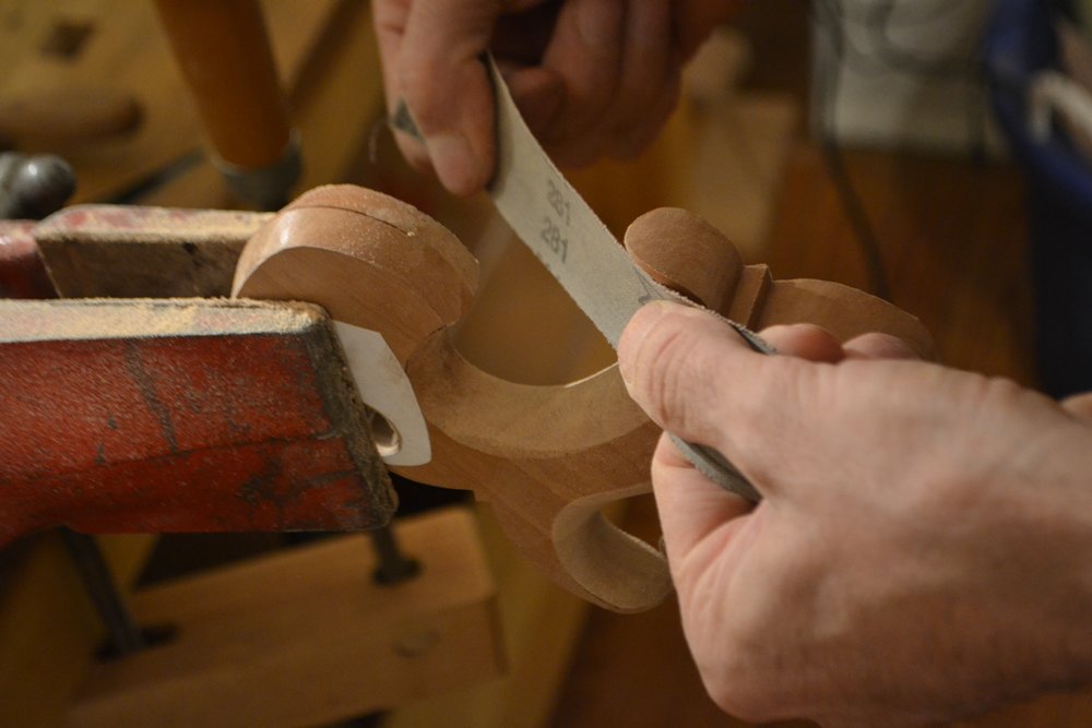 I use cloth backed sandpaper, torn into narrow strips, for all of the sanding on contours.  It is available in a wide variety of grits and backings, but I just buy a bargain box from Klingspor. As long as you don’t have a specific need, it can be a terrific deal.  It’s a wonderful thing to not have to wring out every last bit of life from every scrap of sandpaper – as soon as a strip begins to clog, it gets tossed. A small luxury, perhaps, but anything that lessens the tedium is welcome.